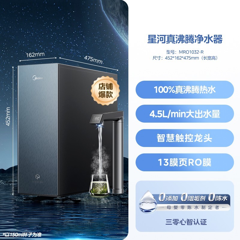 美的星河真沸腾净热直饮家用净水机1800G,集净、热、高于一体,无需外置水箱即热即饮,搭载高效RO反渗透技术,1800加仑大通量,每分钟出水约4.7升,满足全家饮水需求。创新0阻垢剂滤芯,安全无添加,有效防止二次污染,确保每一滴水都纯净安心。支持多段控温,泡茶、冲奶、直饮随心调节,真沸腾杀菌,彻底去除水垢隐患。外观采用极简星河设计,搭配智能触控屏,操作便捷更显高端。