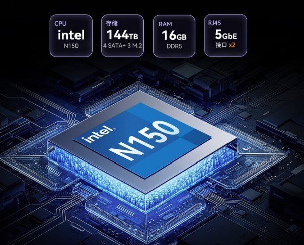 设备硬件配置全面升级,网络端配备双5GbE网口并支持多种Bond聚合模式,实测线性写速度达1010MB/s、4K 随机读写280MB/s,传输10GB的4K视频仅需10秒,速度是传统双2.5G 网口 NAS 的 2 倍以上;存储端创新融合4个3.5英寸HDD盘位与3个M.2 SSD插槽,用户可灵活将SSD设为高速缓存或独立存储池,同时满足热数据高速读写与冷数据大容量归档需求;处理核心采用英特尔N150处理器(Twin Lake 架构),相比前代 N5095,单核性能提升21.7%、多核性能提升 26.3%,集成显卡强化也优化了4K/8K视频转码与本地AI应用表现。