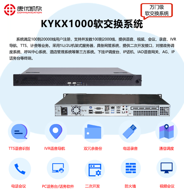 康优凯欣KYKX1000语音交换系统具备丰富的业务能力,单台可提供最大20000注册分机,可采用双机热备,双电源,康优凯欣凭借在融合通信领域多年的应用积累,可为客户提供个性化建设方案,满足客户多元化需求。四川宜宾语音交换系统相关需求可以直接联系厂家康优凯欣。