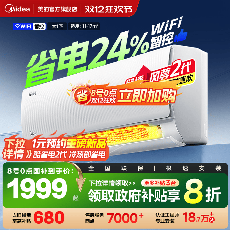 Midea美的酷省电系列N8KS1-1壁挂式空调新一级能效品质之选现正火热促销中这款空调搭载先进节能技术配合高能效等级大幅降低耗电量让您夏日享受清凉的同时轻松节省电费现在通过天猫商城购买还可享国家补贴立减499.8元原价2099.2元现最终到手价仅需1999.2元性价比出众性能优越静音设计智能控温快速制冷热无论是卧室还是客厅都能带来舒适体验数量有限喜欢的朋友抓紧入手别错过这次超值优惠机会