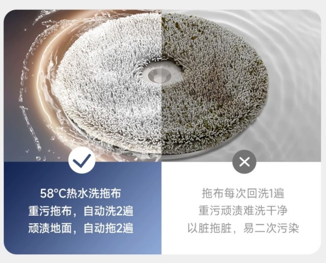 即使在功能和智能设备上实现了升级和完善,但扫地机器人有一个重要软肋就是拖布以及重污区域的清洗。针对人工难以清洁的重污场景,追觅S20Pro搭载了光学智感脏污系统,能够根据地面的脏污程度,智能识别重污区域并自动完成二次清洁。同时为了防止已经脏污的拖布再度污染地面,经基站智能检测判定后,会采用58°C热水也会对拖布进行二次清洗,这与洗衣机通过把水加热提升清洁效果的原理类似,能大大提高扫地机器人的清洁力。